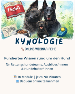 Mit dieser Webinarreihe möchte ich fundiertes kynologisches Wissen praxisnah und verständlich weitergeben und Rettungshundeteams/Hundeführer eine zusätzliche theoretische Weiterbildung anbieten.Die Webinarreihe umfasst 10 Module mit jeweils ca. 90 Minuten. Zwischen den einzelnen Modulen liegen sechs Wochen, sodass genügend Zeit bleibt, die Inhalte in Ruhe zu verarbeiten und in die Praxis mitzunehmen. Insgesamt erstreckt sich die Reihe damit über etwa 12 Monate – bewusst so gestaltet, dass Wissen nicht überladen, sondern nachhaltig vermittelt wird. Diese Module sind sowohl für neue Hundeführerinnen und Hundeführer als auch für erfahrene Teams und Ausbilder geeignet.